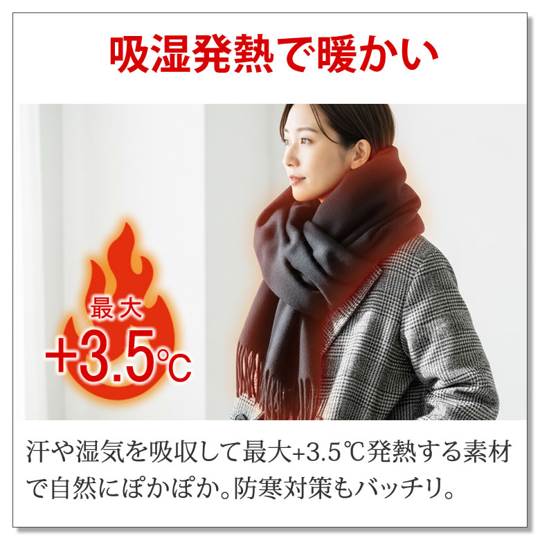 | アウトドアブランドのラドウェザー から、吸湿発熱ストールが登場! 汗や湿気を吸収して最大+3.5℃発熱する素材が、自然にぽかぽかと心地よいぬくもりを生み出す。 まるで毛布にくるまれているような保温力で、冷たい外気をシャットアウト。 発熱温度や保温性能は検査機関での試験により確認されているので、そのあたたかさはお墨付き。 肌に触れる面はチクチクせず、なめらかでやさしい肌ざわり。 首元に巻いても肩に掛けてもストレスフリー。 ふんわりウォームタッチと、さらっとスムースタッチの2タイプから好みの質感を選べる。 男女問わず使える落ち着いたデザインで、通勤や通学スタイルにもぴったり。 長さ200cmの大判サイズだから、マフラーとしても、ひざ掛けや羽織りとしても自在にアレンジ可能。 気分やシーンに合わせてスタイルチェンジも楽しめる。 一枚あれば、外出にもおうち時間にも重宝。 冷え知らずの冬を、やさしいぬくもりとともに。 ■吸湿発熱で暖かい 汗や湿気を吸収して最大+3.5℃発熱する素材で自然にぽかぽか。防寒対策もバッチリ。 ■しっかり保温効果 まるで毛布のようなぬくもりをキープ。外の冷気を通しにくく、あたたかさを逃さない。 ■信頼できる確かな性能 発熱温度と温度の保持性能は検査機関による試験で認められているから安心。 ■やさしい肌ざわり チクチク感のないなめらかさ。首元に巻いても、肩に掛けてもストレスフリー。 ■選べる2つの心地よさ ふんわり暖かいウォームタッチ、さらっと軽やかなスムースタッチの2タイプから好みで選べる。 ※どちらも吸湿発熱素材です ■誰にでも似合うデザイン 落ち着いた色味で、男女問わず使いやすい。通勤スーツにも、学生の通学スタイルにも馴染む。 ■長さ200cmの大判サイズ 身体をすっぽり覆うことができる長さ200cmの大判サイズ。広げても、巻いても、思いのまま。 ■マフラー代わりに 首元にボリュームを作るだけで顔まわりを華やかに。防寒しながら、コーデのアクセントにも。 ■ひざ掛けに デスクワークや車内、リラックスタイムでもサッと広げれば冷えやすいも足元ポカポカに。 ■アウター代わりに 肩から背中まですっぽり羽織れておしゃれに防寒。季節の変わり目にも重宝する。 ■スタイルチェンジも自在 その日の気分やシーンで巻き方簡単アレンジ。オンにもオフにも合わせやすい万能アイテム。 ■ふんわり巻いて小顔見え ほどよい厚みと立体感で、顔まわりが自然に華奢見え。シンプルでも映える存在感。 | |