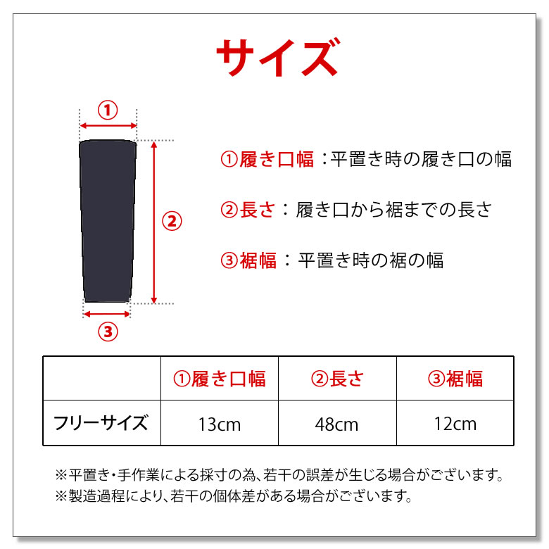 サイズ | フリーサイズ(履き口幅13cm×長さ48cm×裾幅12cm) |