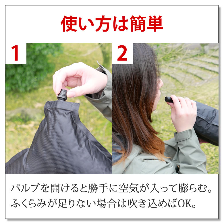 | アウトドアブランドのラドウェザー から、キャンプが快適になる枕が誕生。 バルブを開けるだけで自動で空気が入って膨らむインフレーターピロー(インフレータブルピロー)なので、面倒くさい空気入れ作業は必要なし。 バルブを開けて置いておくだけで膨らむから、手間も時間もかからない。 内部にはウレタンスポンジが入っているので、エア枕と比べると段違いの弾力とフィット感。 寝心地に差が出る。 サイズは44cm×33cm。 頭はしっかり包み込むのに、狭いテント内や車内でも邪魔にならないちょうどいいサイズ。 腰枕などちょっとしたクッション代わりにも使いやすいサイズ感。 中央が窪んだ形状になっているので、頭と首にしっかりフィット。 背骨や頸椎に負担をかけない自然な寝姿勢をキープして首や肩にも優しい。 空気の入れ具合でしっかり硬めにもふんわり柔らかめにもできるから、自分好みの硬さで眠れるのも嬉しい。 表地には軽くて丈夫な「リップストップ」生地を使用。 これは自宅のふかふかの布団の上以外で使う事の多いキャンプ枕ならではの外せないこだわり。 空気を抜いてたためば、サイズはわずか直径9cm×長さ33cm。 収納ケースもついているので、どこにでも持ち歩きできる。 キャンプや車中泊はもちろん、花見やピクニックなどレジャー時のお昼寝枕や高速バスなどでの長時間移動にも。 この枕さえあれば、どんな場所でもぐっすり眠れる。 ■自動で膨らむからラクチン バルブを開くだけで自動で空気が入るので、面倒な空気入れは必要ありません。 ■極上の寝心地 ふわふわのウレタンスポンジが入っているので、エア枕と比べると段違いの弾力とフィット感。 ■使いやすいサイズ感 44cm×33cmというサイズは、頭はしっかり包み込むのに、狭いテント内や車内でも邪魔にならないちょうどいいサイズ。 ■頭にフィットする形状 中央が凹んだ形状で、頭と首にフィット。 自然な寝姿勢をキープして首や肩にも優しい。 ■自分好みの硬さにできる 空気の入れ具合で硬さを変えられる。 硬め派も柔らかめ派もみんな満足できる。 吹きいれる空気が少ない場合はふんわり柔らか、空気が多い場合はしっかり硬めになる。 ■破れにくくて長持ち 軽くて丈夫な「リップストップ」生地を使用。 自宅以外で使う枕ならではのこだわり。 ■コンパクトに持ち歩ける 空気を抜いて小さくたためて、収納ケースもついているので、どこにでも持ち歩きできる。 ■使い方は簡単 バルブを開けると勝手に空気が入って膨らむ。 ふくらみが足りない場合は吹き込めばOK。 ■収納も簡単 収納も空気を抜いて巻くだけ。 日本語説明書も付いているので安心。 ■キャンプやレジャーに 花見やピクニックなどレジャー時の昼寝にも使えるのでお子様にも。 ■長時間移動や車中泊に 睡眠時はもちろん腰枕としても使えるので、高速バスなどでの長時間移動にもおススメ。 ■マットとセットで超快眠 同じく自動で膨らむキャンプマットも一緒に使えばどんな環境でもしっかり熟睡できる。 マットの詳細はこちら。 | |
