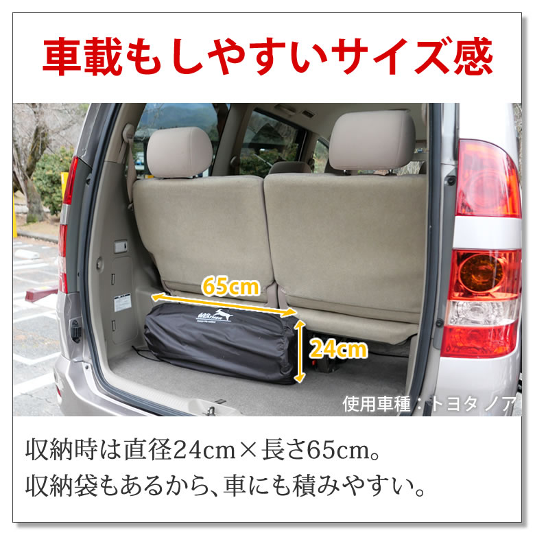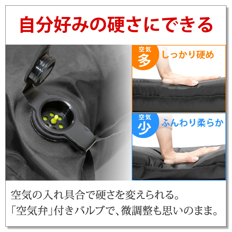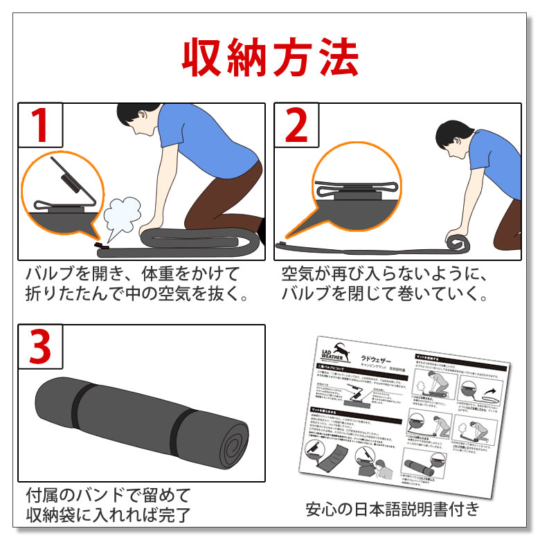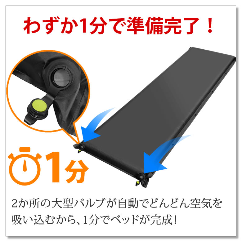 | アウトドアブランドのラドウェザー から、キャンプが快適になるマットが誕生。 バルブを開けるだけで自動で空気が入って膨らむインフレーターマット(インフレータブルマット)なので、面倒くさい空気入れ作業は必要なし。 内部には8cm厚のウレタンスポンジが入っているので、適度な弾力性と厚みで寝心地は抜群。 小石や枝等の凹凸や地面からの冷えも解消でき、体圧も分散できるから睡眠の質もアップ。 このマットがあれば、テントがまるでスイートルームのような快適空間に早変わり。 設営にかかる時間もわずか1分! 高速の秘密は口径22mmの大型バルブが短時間で効率よく多くの空気を吸収するから。 バルブを開ければすぐに眠れて、1日遊んで疲れたときでも大丈夫。 空気の入れ具合でしっかり硬めにもふんわり柔らかめにもできるから、自分好みの硬さで眠れる。 空気が逆流しない「空気弁」付きのバルブなので、微調整も思いのまま。 マットどうしを連結できるボタン付きなので、隙間に段差が出来にくく家族で「川の字」もOK。 表面は撥水加工で水が浸みこまないので、うっかり飲み物をこぼしても大丈夫。 もし穴が空いても自分で修理できる「補修キット」がついているので長く使えてコスパも抜群。 ぐっすり眠れれば、せっかくのキャンプで「前日の疲れが抜けていなくて楽しめない」なんてもったいない事は有りません。 ■自動で膨らむからラクチン バルブを開くだけで自動で空気が入るので、面倒な空気入れは必要ありません。 ■極上の寝心地 適度なクッション性が体にフィットし、まるで自宅のベッドで寝ている様に朝まで熟睡できる。 ■体圧分散して体が痛くない 8cm厚のウレタンフォームで体圧を分散。 石などの凹凸や、地面からの冷えも解消できる。 ■わずか1分で準備完了! 2か所の大型バルブが自動でどんどん空気を吸い込むから、1分でベッドが完成! ■自分好みの硬さにできる 空気の入れ具合で硬さを変えられる。 「空気弁」付きバルブで、微調整も思いのまま。 空気が多いとしっかり硬め、空気が少ないとふんわり柔らか。 ■2枚を連結すれば家族もOK! マットどうしを繋ぎ合わせられるボタン付き。 隙間ができないから、「川の字」でも眠れる。 ※このページで販売しているのは、単品(マット1枚)です。 ■はっ水加工でお手入れ楽々 水が浸み込まず汚れも付きにくいので、飲み物をこぼしても安心。 ■車載もしやすいサイズ感 収納時は直径24cm×長さ65cm。 収納袋もあるから、車にも積みやすい。 ■修理キット付きで長く使える 穴が空いた時には自分で修理できるので、長く使えて高コスパ。 ■車中泊でも活躍 ミニバンなどにぴったり収まるサイズ。 座席の段座も解消できてしっかり眠れる。 ■対応車種 ステーションワゴン、ワンボックス、ミニバン、SUVなど幅広い車種に対応。 フォレスター、ワゴンR、ハスラー、ウェイク、RAV4、タント、N-BOX、ヴォクシー、セレナ、ノア、ステップワゴン、エルグランド、フリードなど多くの車種に対応しています。 ■収納方法 1 バルブを開き、体重をかけて折りたたんで中の空気を抜く。 2 空気が再び入らないように、バルブを閉じて巻いていく。 3 付属のバンドで留めて収納袋に入れれば完了 安心の日本語説明書付き。 ■枕もあれば、もっと快適 同じく自動で膨らむ枕(別売り)も揃えれば、熟睡間違いなし。 ■枕も一緒に買うとお得! このページで購入すると、通常価格1,480円の枕が1,000円 で購入できます。 このページからの購入のお客様のみの限定価格です! 枕の詳細はこちら | |