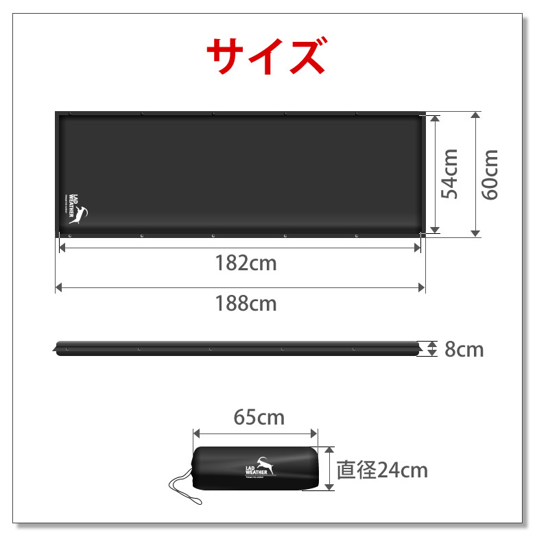 サイズ | 全幅60cm×全長188cm マット部幅54cm×マット部長さ182cm×厚み8cm 収納サイズ 直径24cm×長さ65cm |