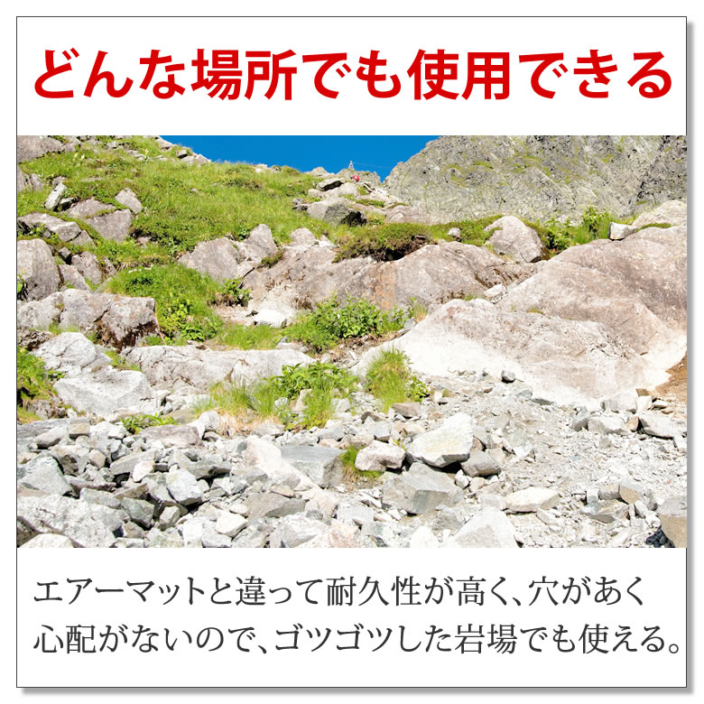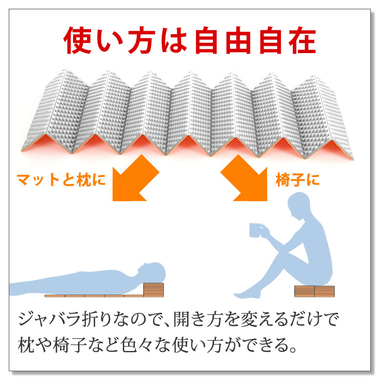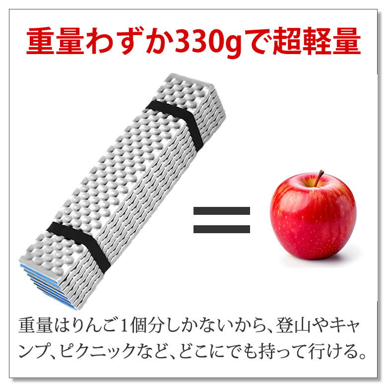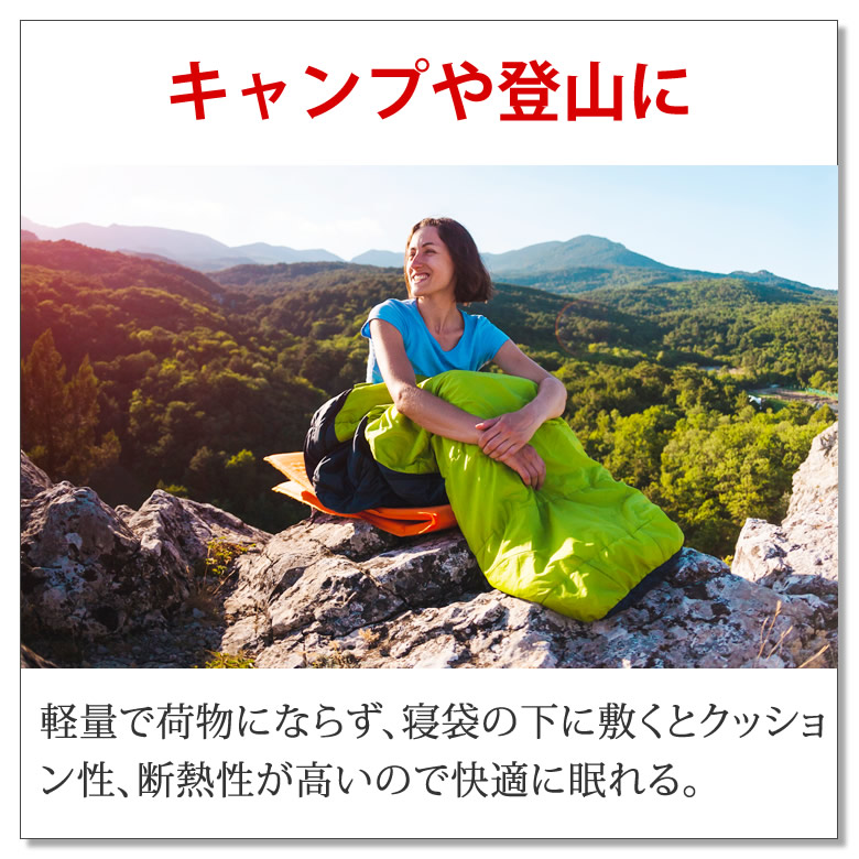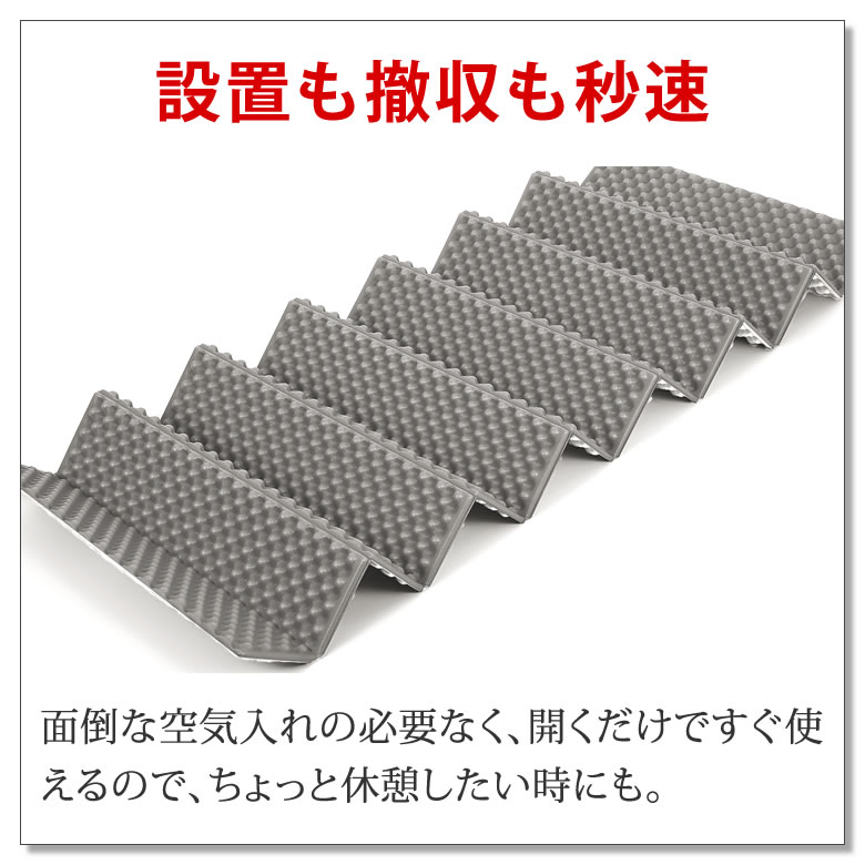 | アウトドアブランドのラドウェザー から、軽量で持ち運びも便利なアルミキャンプマットが誕生。 片面に高い断熱性能と熱反射効果をプラスするアルミ加工を行ったリバーシブル仕様。 冬はアルミ面を上にすると体温を反射して暖かく、夏はアルミ面を下にすれば体温は逃がしながら地面からの熱を遮断。 表裏を使い分ければオールシーズン使える。 素材には高性能なXPEフォームを使用。 軽量でクッション性、断熱性、耐久性に優れているので、地面のゴツゴツ感を和らげ、キャンプや登山などの、固い地面の屋外でも快適に眠れる。 さらに、凹凸加工で体圧分散。 点で支えて荷重を分散するから、底つき感も軽減できる。 大人が寝転べるサイズなのに、重量はわずか330gと超軽量。 リンゴ1個分の重さしかないので、登山やキャンプでも荷物にならない。 エアーマットと違って、面倒な空気入れの必要なく設置も撤収も秒速。 ジャバラ折り(アコーディオン式)なので、開くだけですぐ使えるので、「ちょっと休憩」したい時にもサッと敷いてサッと片づけられる。 さらに穴あきの心配も無いので地面に直接敷けて、ゴツゴツした岩場でも使える。 開き方を変えるだけで枕や椅子など色々な使い方ができたり、自分好みのサイズにカットしたり、使い方に合わせてカスタマイズできるのも魅力。 キャンプ、登山、釣りなどのアウトドアレジャーかもちろん、防災用としてもおすすめ。 ■片面アルミのリバーシブル 片面に高い断熱性能と熱反射効果をプラスするアルミ加工を行ったリバーシブル仕様。 ■冬は暖かく、夏は涼しい 冬はアルミ面を上にすると体温を反射して暖かい。 夏はアルミ面を下にすれば熱を逃がせる。 ■高性能なXPEフォーム使用 素材は軽量でクッション性、断熱性、耐久性に優れたXPEフォーム。 地面の硬さを和らげる。 ■凹凸加工で体圧分散 凹凸加工が体を点で支えるから、荷重を分散し、底つき感を軽減する。 空気も流れて蒸れにくい。 ■重量わずか330gで超軽量 重量はりんご1個分しかないから、登山やキャンプ、ピクニックなど、どこにでも持って行ける。 ■設置も撤収も秒速 面倒な空気入れの必要なく、開くだけですぐ使えるので、ちょっと休憩したい時にも。 ■使い方は自由自在 ジャバラ折りなので、開き方を変えるだけで枕や椅子など色々な使い方ができる。 ■どんな場所でも使用できる エアーマットと違って耐久性が高く、穴があく心配がないので、ゴツゴツした岩場でも使える。 ■丸洗いできてお手入れ簡単 水を吸いにくい素材なので、汚れた時は丸洗いも出来て衛生的。 ■コンパクトサイズ 56cm×12cm×13cmと小さくたためる。 持ち運びにも便利なゴムバンド付き。 ■自分サイズにカットOK 好きな長さにカットできるので、身長に合わせてカットすれば、さらにコンパクトになる。 ■キャンプや登山に 軽量で荷物にならず、寝袋の下に敷くとクッション性、断熱性が高いので快適に眠れる。 ■防災用に コンパクトに収納できるから、備えておけば停電で暖房が使えない時にも心強い。 ■釣りやレジャーに さっと広げてすぐに使え、レジャーシートよりクッション性も高いので、「ちょっと休憩」にも。 | |