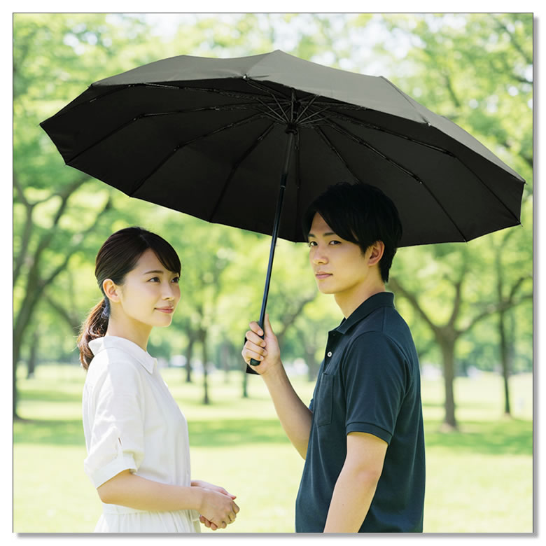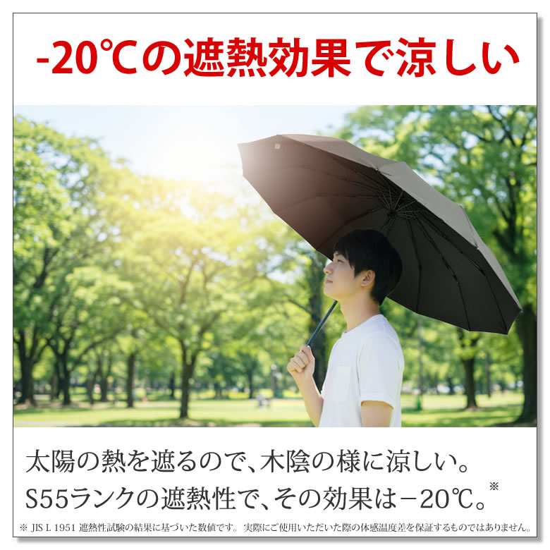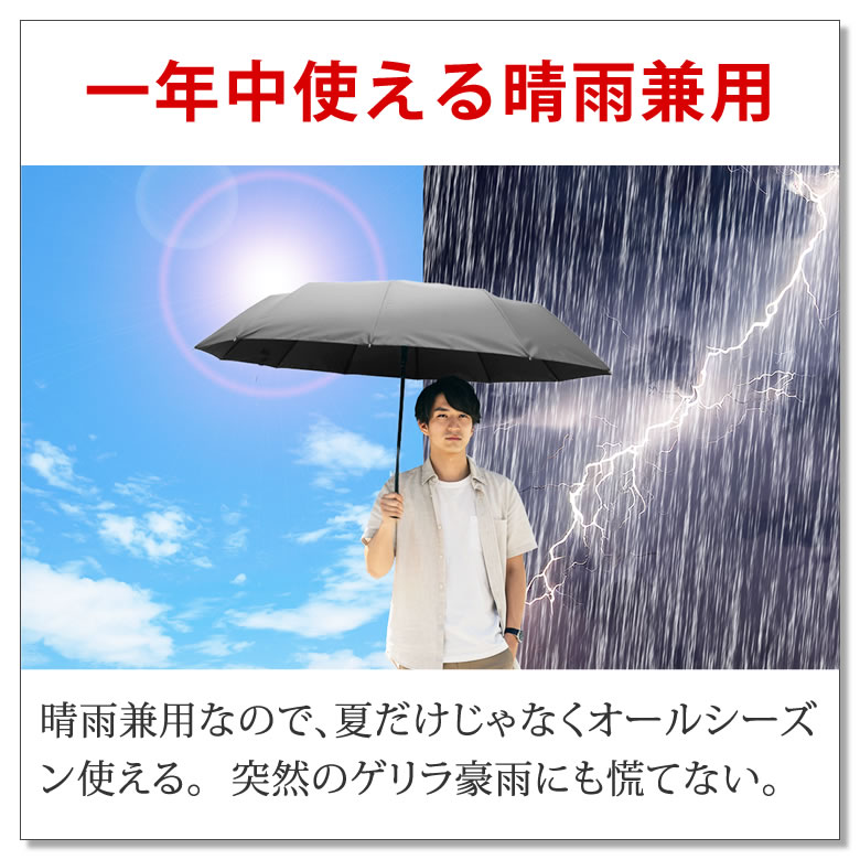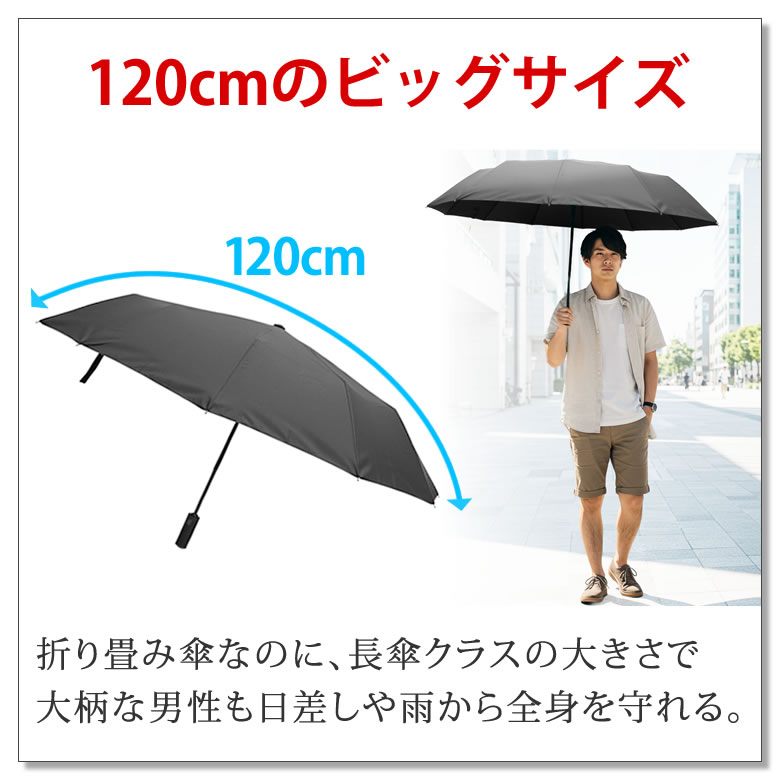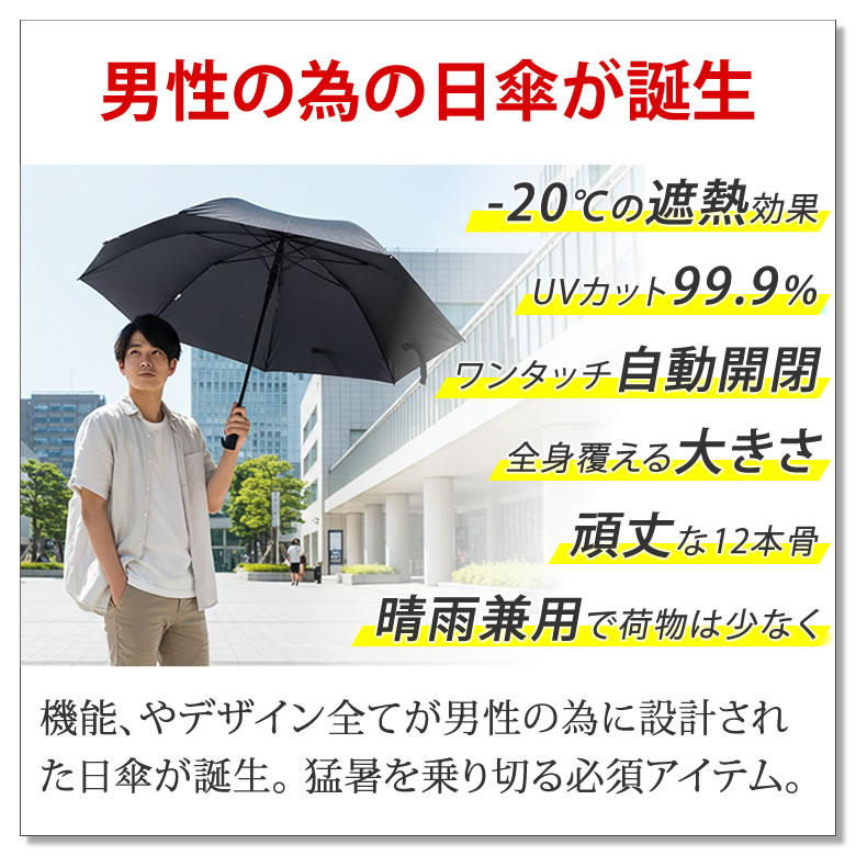| アウトドアブランドのラドウェザーから、晴雨兼用の折りたたみ傘が登場。 完全遮光&遮熱効果で、まるで木陰のような涼しさを実現。 地面からの反射光もブラックコーティング裏地がしっかりガードし、 -20℃の遮熱性、UVカット率は驚異の99.9%以上、UPF50+で紫外線もシャットアウト。 さらに、フライパンでもおなじみのテフロン加工で超撥水・防汚性も抜群。 急な雨でも水を弾き、いつでも清潔。 頑丈な12本骨とグラスファイバー製の親骨で風にも強く、 開閉はワンタッチで片手操作もスムーズ。 折りたたみ式ながら、開くと120cmのビッグサイズで、しっかり全身をカバー。 男性の手にもフィットする大きめグリップと高撥水収納袋つきで、使い勝手も抜群。 猛暑もゲリラ豪雨もこれ一本でスマートに乗り切る、頼れる一本。 ■男性の為の日傘が誕生 機能やデザイン全てが男性の為に設計された日傘が誕生。 猛暑を乗り切る必須アイテム。 ■-20℃の遮熱効果で涼しい 太陽の熱を遮るので、木陰の様に涼しい。S55ランクの遮熱性で、その効果は-20℃。※ ※ JIS L 1951 遮熱性試験の結果に基づいた数値です。 実際にご使用いただいた際の体感温度差を保証するものではありません。 ■光を通さない100%遮光 完全遮光で、強烈な真夏の太陽光をカット。 暑さ、眩しさ、紫外線の全てが防げる。 ■UVカット率99.9%以上! 紫外線遮蔽率は最高値の99.9%以上。さらにUPFも最高値の50+で、日焼けを防ぐ。 ■地面の反射光からも守る 光を吸収するブラックコーティング裏地で、上からの日差しだけじゃなく地面からの反射もガード。 ■一年中使える晴雨兼用 晴雨兼用なので、夏だけじゃなくオールシーズン使える。 突然のゲリラ豪雨にも慌てない。 ■超撥水テフロンTM加工 フライパンなどでおなじみのテフロンTM加工で、傘に水滴が残らない抜群の水切れの良さ。 ■防汚性も高く汚れにくい テフロンTM加工は水だけではなく汚れにも強い。いつでもきれいが保ててお手入れも楽々。 ■その確かな性能は実証済 遮熱性、UVカット率、UPF、撥水性、防汚性は検査機関で試験を行い、高い性能が立証された。 ■頑丈な12本骨で風に強い 骨の数が多い12本。強度が高く、風が強い日も安心して使える。 ■丈夫なグラスファイバー製 親骨は釣り竿にも使われるグラスファイバー製。軽量で強い「しなり」を持ち簡単には折れない。 ■ボタンを押すだけで開閉 開くのも閉じるのも手元のボタンを押すだけ。荷物を持っていても片手で開閉できる。 ※手で折りたたむと破損する恐れが有りますので、ご注意ください。 ■120cmのビッグサイズ 折り畳み傘なのに、長傘クラスの大きさで大柄な男性も日差しや雨から全身を守れる。 ■柄が大きくて持ちやすい 一般的な折り畳み傘より持ち手が大きい。男性の大きな手でも握りやすい。 ■専用の収納袋付き 傘本体と同じ高撥水生地の収納袋つき。 濡れた傘を鞄に入れても周りの荷物を濡らさない。 | |