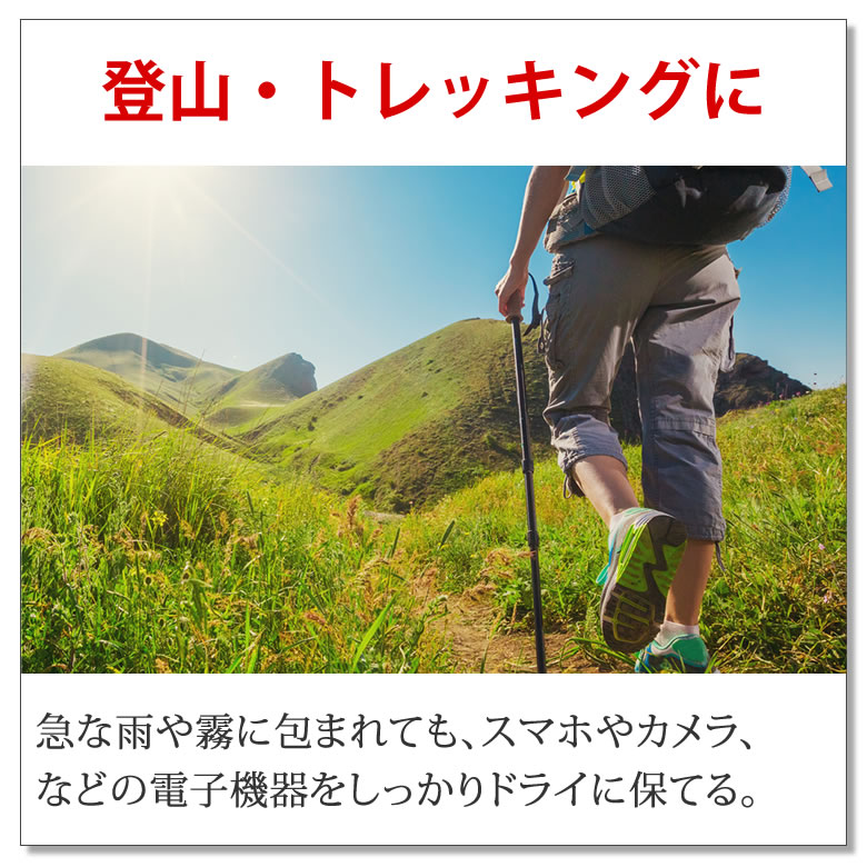 急な雨や霧に包まれても、スマホやカメラ、などの電子機器をしっかりドライに保てる。
