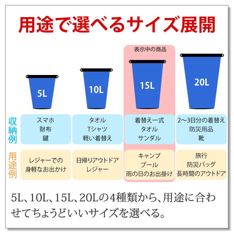 5L、10L、15L、20Lの4種類から用途に合わせてちょうどいいサイズを選べる。