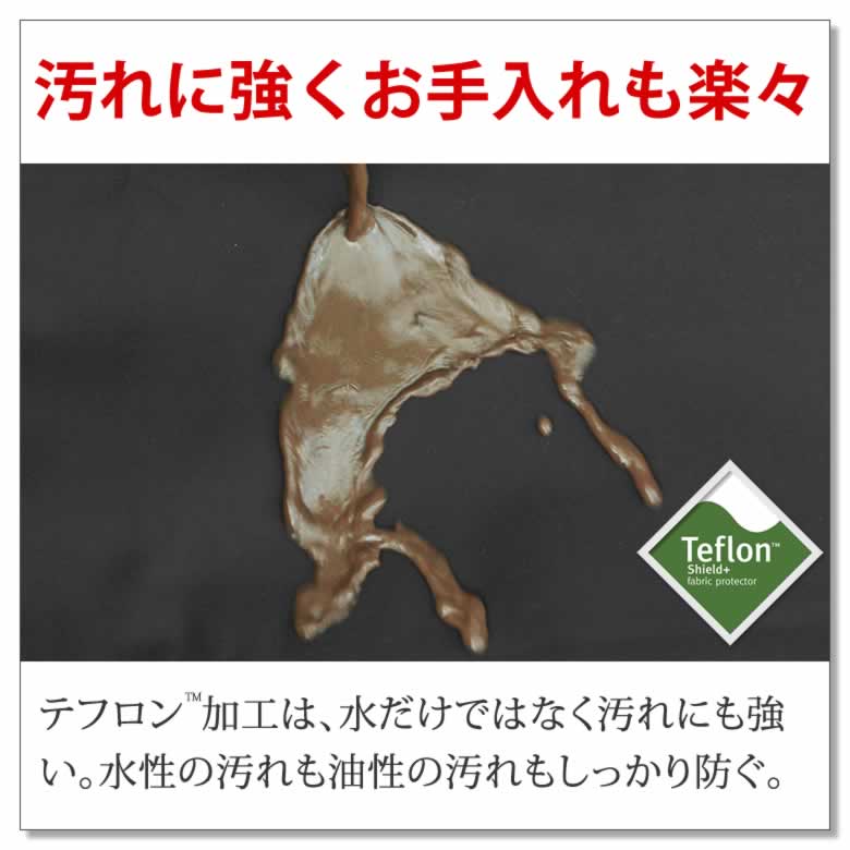 テフロンTM加工は、水だけではなく汚れにも強い。水性の汚れも油性の汚れもしっかり防ぐ。