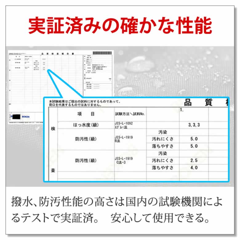 撥水、防汚性能の高さは国内の試験機関によるテストで実証済。 安心して使用できる。