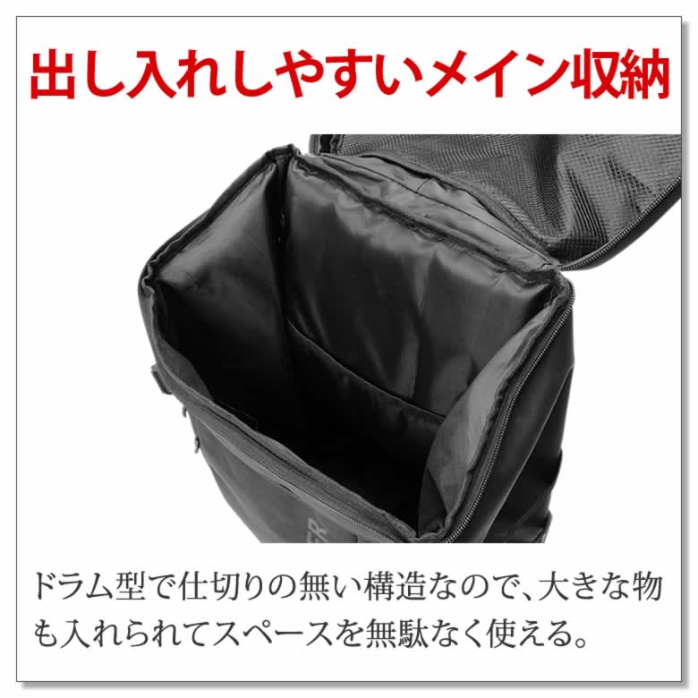 大きな荷物も入れやすいドラム型のメイン収納は仕切りがなく、スペースを無駄なく活用可能。