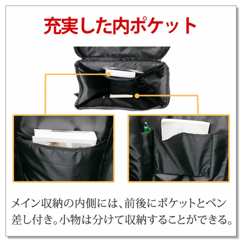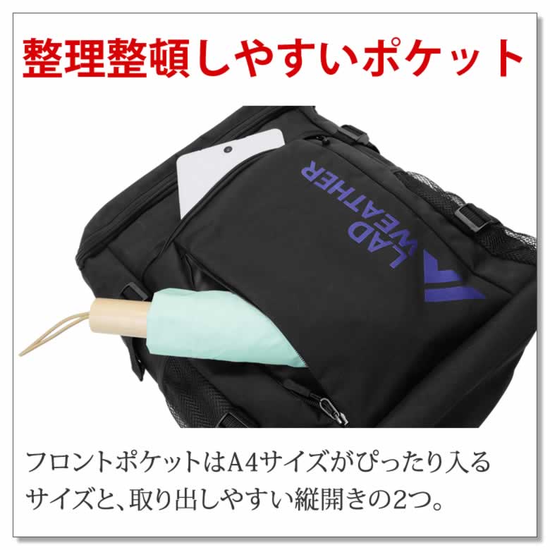 A4対応のフロントポケットや500mlペットボトルが収まるサイドポケットなど、