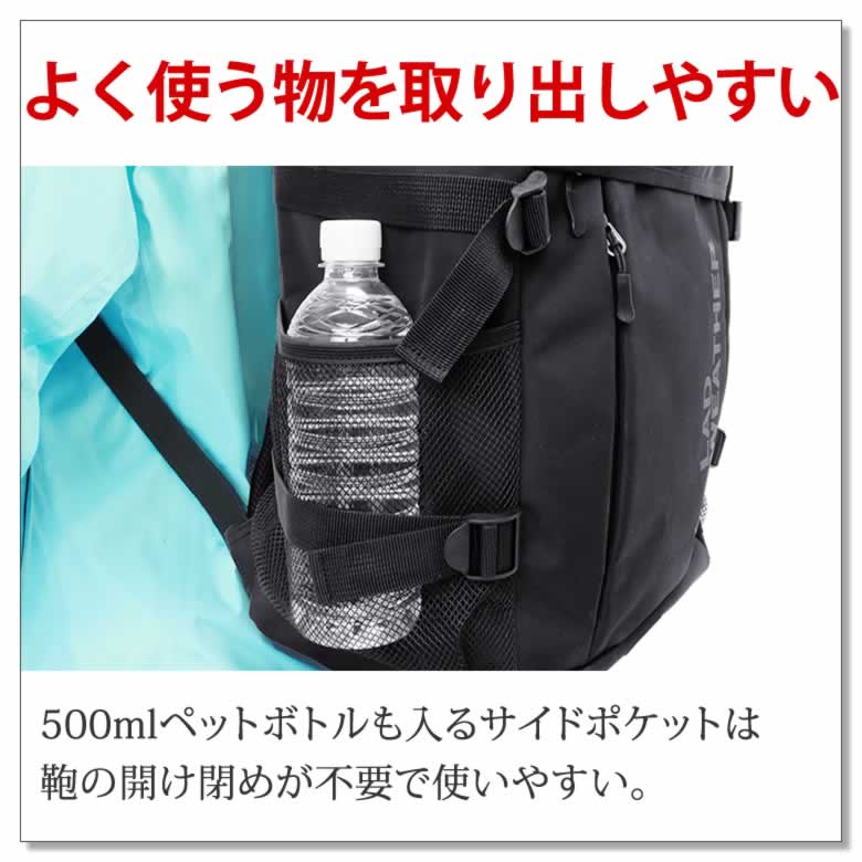500mlペットボトルも入るサイドポケットは鞄の開け閉めが不要で使いやすい。