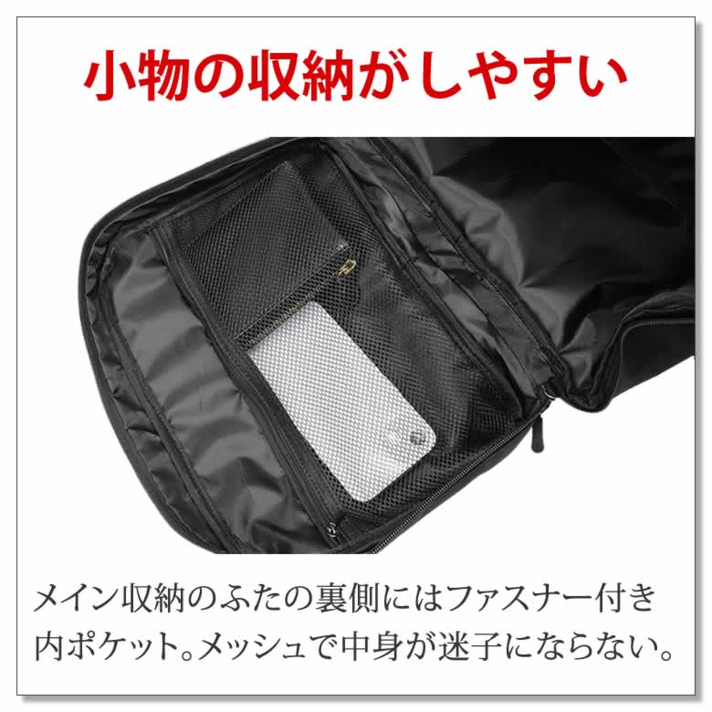 メイン収納のふたの裏側にはファスナー付き内ポケット。メッシュで中身が迷子にならない。