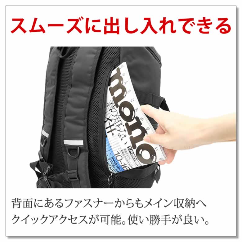 さらに背面ファスナーからメイン収納へアクセスでき、荷物の出し入れもスムーズ。
