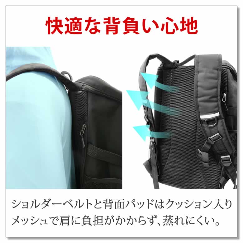 背負い心地にも配慮し、クッション入りメッシュのショルダーと背面パッドで快適。
