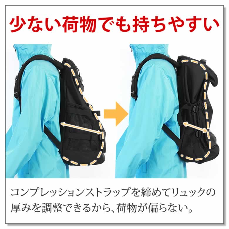 コンプレッションストラップを締めてリュックの厚みを調整できるから、荷物が偏らない。