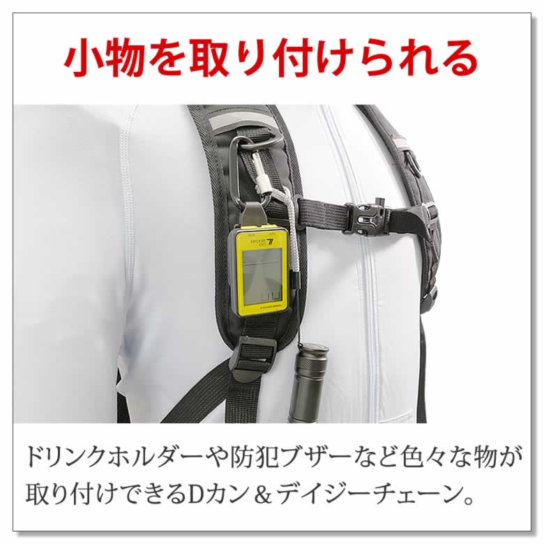ドリンクホルダーや防犯ブザーなど色々な物が取り付けできるDカン&デイジーチェーン。
