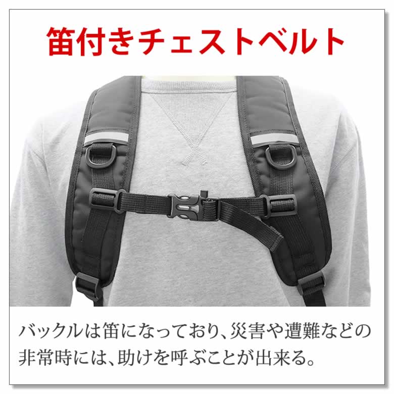 笛付きチェストベルトはもしもの非常時にも役立つ。