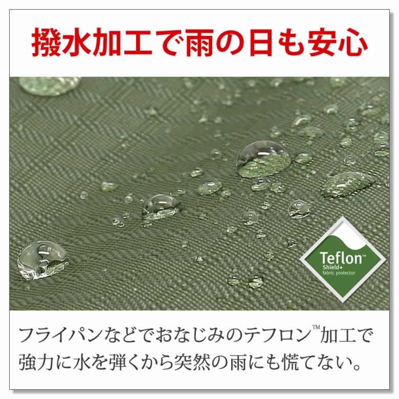 フライパンなどでおなじみのテフロンTM加工で強力に水を弾くから突然の雨にも慌てない。