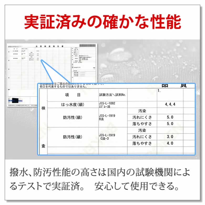 撥水、防汚性能の高さは国内の試験機関によるテストで実証済。 安心して使用できる。