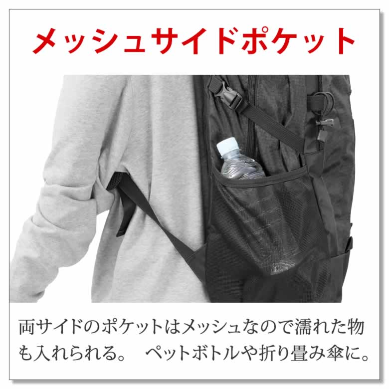 両サイドのポケットはメッシュなので濡れた物も入れられる。 ペットボトルや折り畳み傘に。