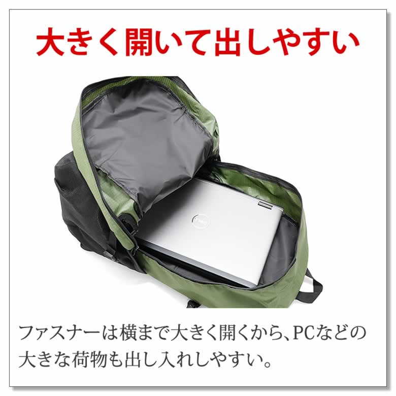 ファスナーは横まで大きく開くから、PCなどの大きな荷物も出し入れしやすい。