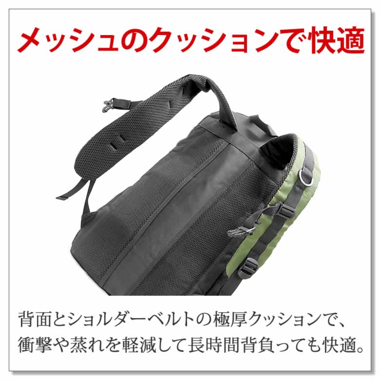 背面とショルダーベルトの極厚クッションで、衝撃や蒸れを軽減して長時間背負っても快適。