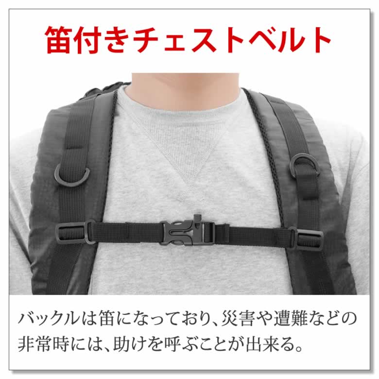 バックルは笛になっており、災害や遭難などの非常時には、助けを呼ぶことが出来る。