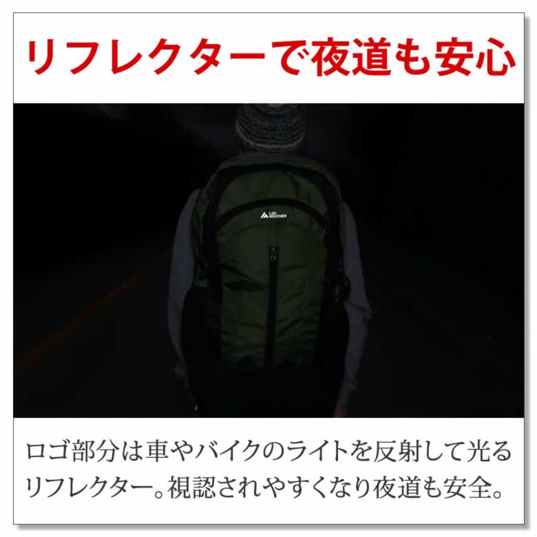 ロゴ部分は車やバイクのライトを反射して光るリフレクター。視認されやすくなり夜道も安全。