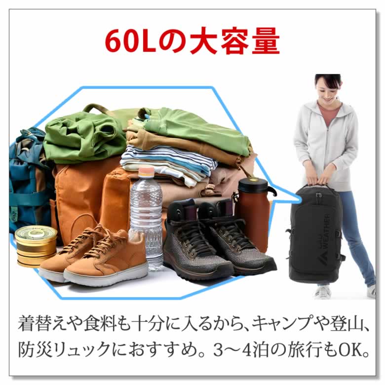 着替えや食料も十分に入るから、キャンプや登山、防災リュックにおすすめ。 3~4泊の旅行もOK。