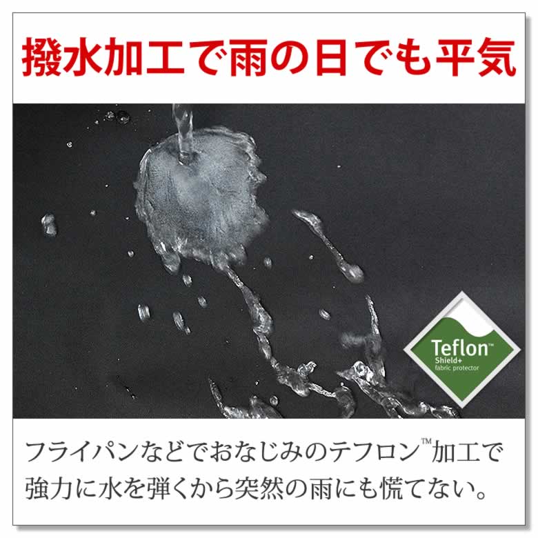 フライパンなどでおなじみのテフロンTM加工で強力に水を弾くから突然の雨にも慌てない。