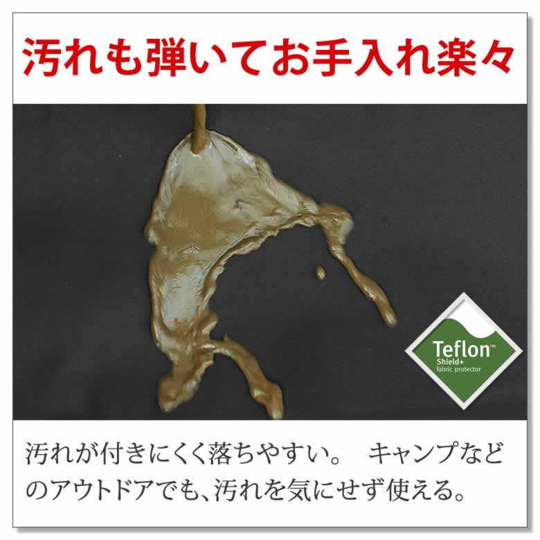 生地にはテフロン加工を施し、雨を弾くはっ水性に加え、防汚・防油性能も発揮。