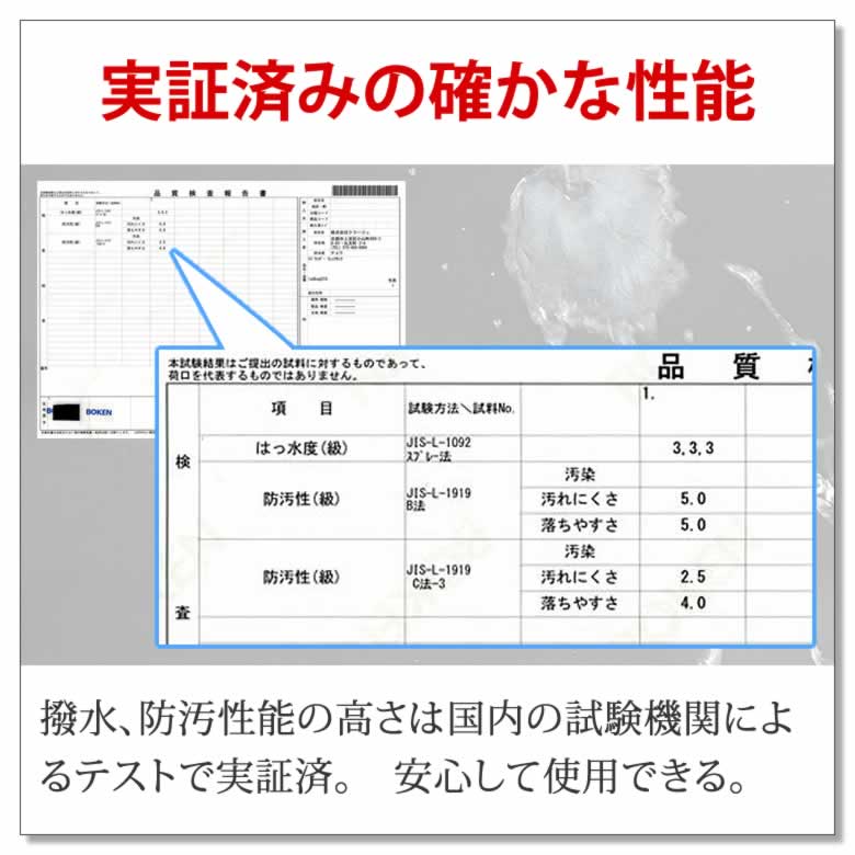 撥水、防汚性能の高さは国内の試験機関によるテストで実証済。 安心して使用できる。