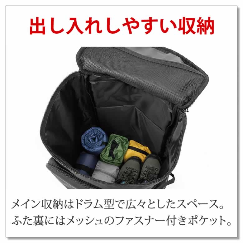 ドラム型のメイン収納や大型フロントポケット、背面ファスナーなど、出し入れのしやすさも抜群。
