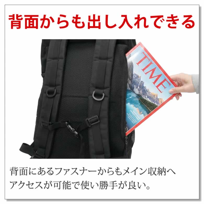 背面にあるファスナーからもメイン収納へアクセスが可能で使い勝手が良い。