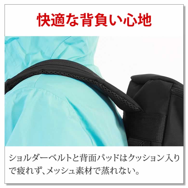 ショルダーベルトと背面パッドはクッション入りで疲れず、メッシュ素材で蒸れない。