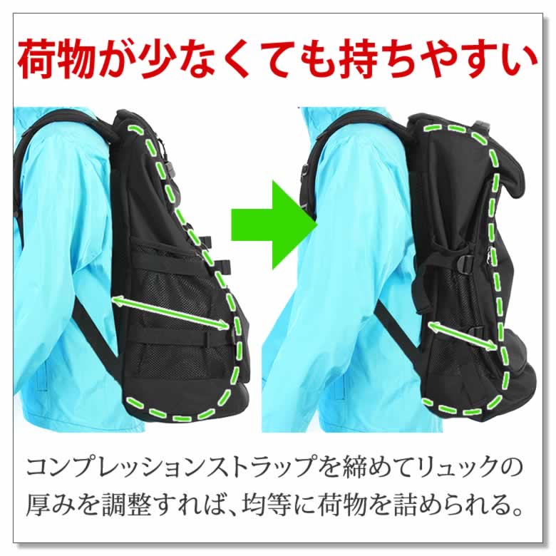 コンプレッションストラップを締めてリュックの厚みを調整すれば、均等に荷物を詰められる。
