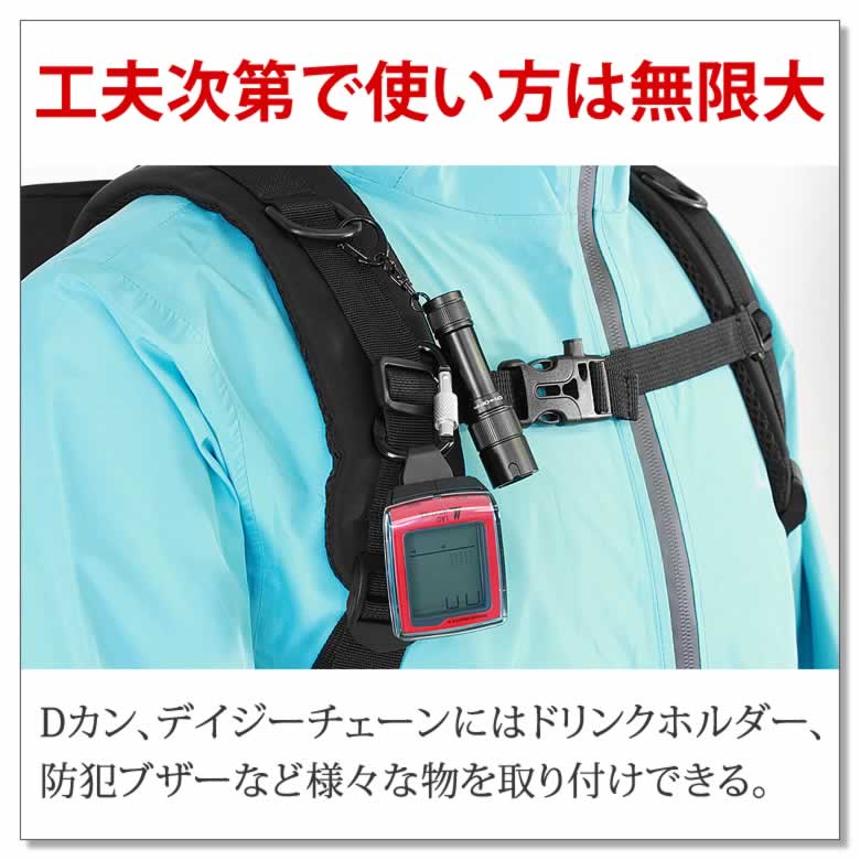 非常時に役立つ笛付きチェストベルトや拡張用Dカンも備え、日常から非常時まで、心強く使える。