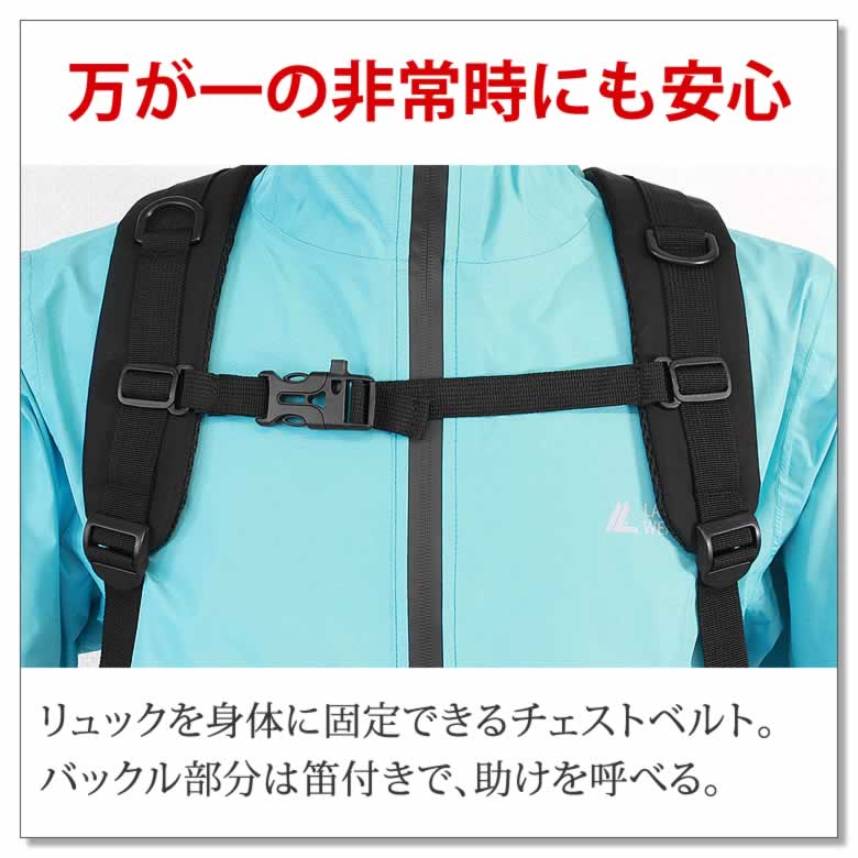 リュックを身体に固定できるチェストベルト。バックル部分は笛付きで、助けを呼べる。