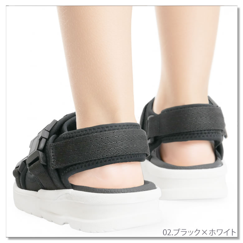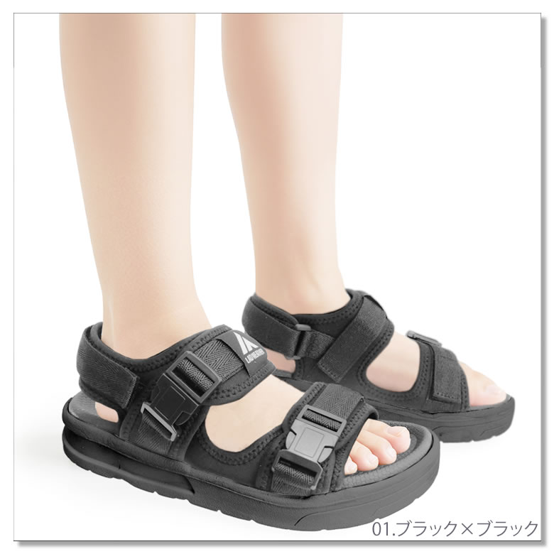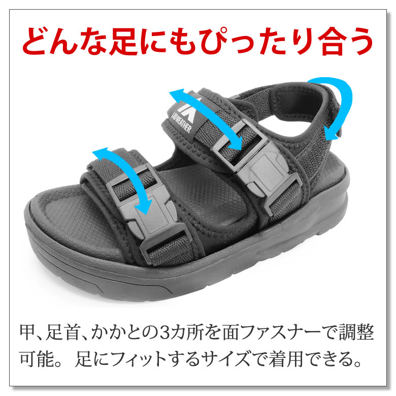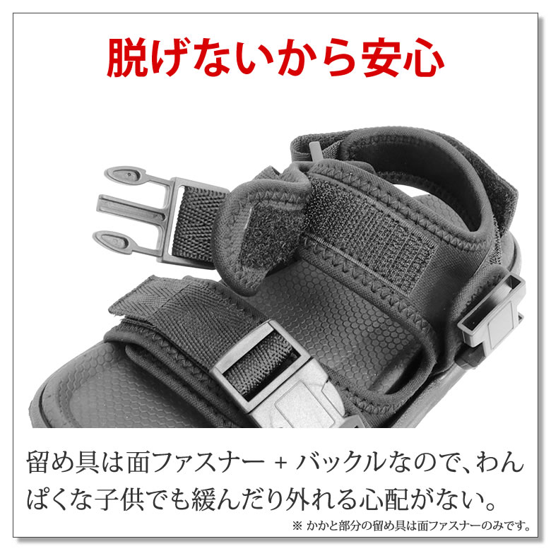 面ファスナーとバックルで足首・甲・かかとの3カ所を調整できるから、どんな足にもぴったりフィットして脱げにくい。