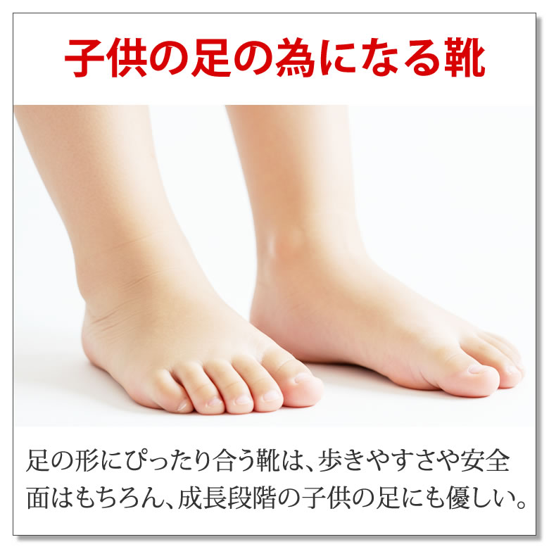 足の形にぴったり合う靴は、歩きやすさや安全面はもちろん、成長段階の子供の足にも優しい。