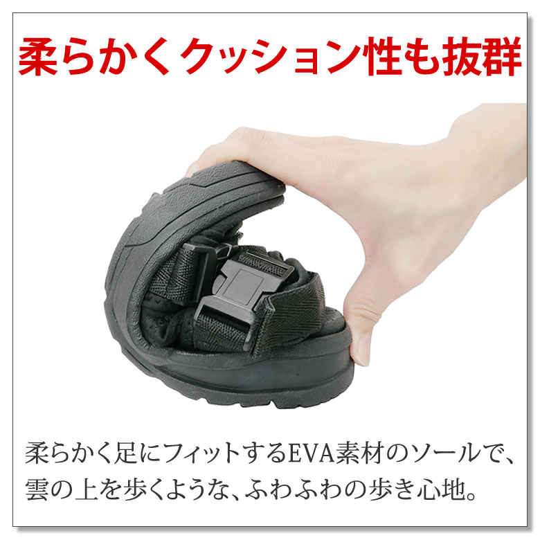 柔らかく足にフィットするEVA素材のソールで、雲の上を歩くような、ふわふわの歩き心地。