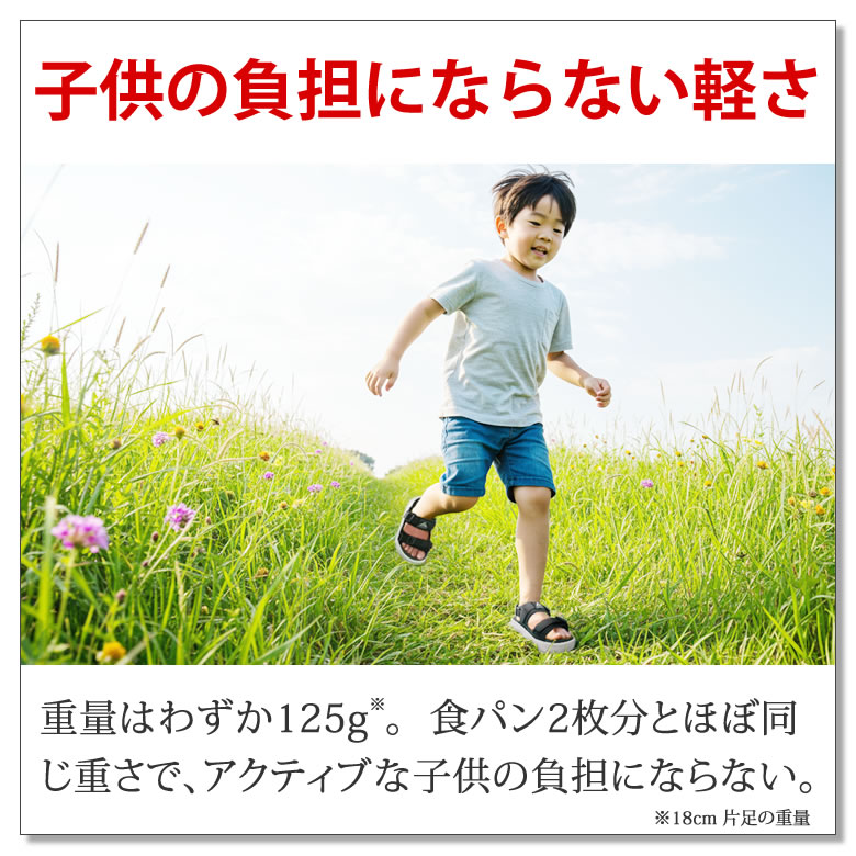 重量はわずか125g※。 食パン2枚分とほぼ同じ重さで、アクティブな子供の負担にならない。