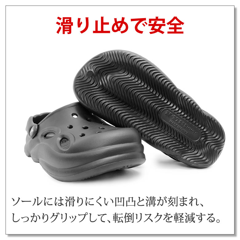 ソールには滑りにくい凹凸と溝が刻まれ、しっかりグリップして、転倒リスクを軽減する。